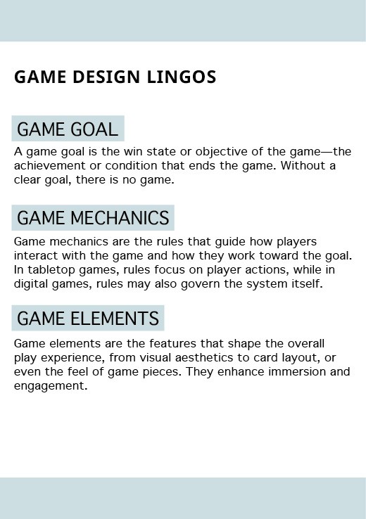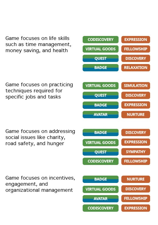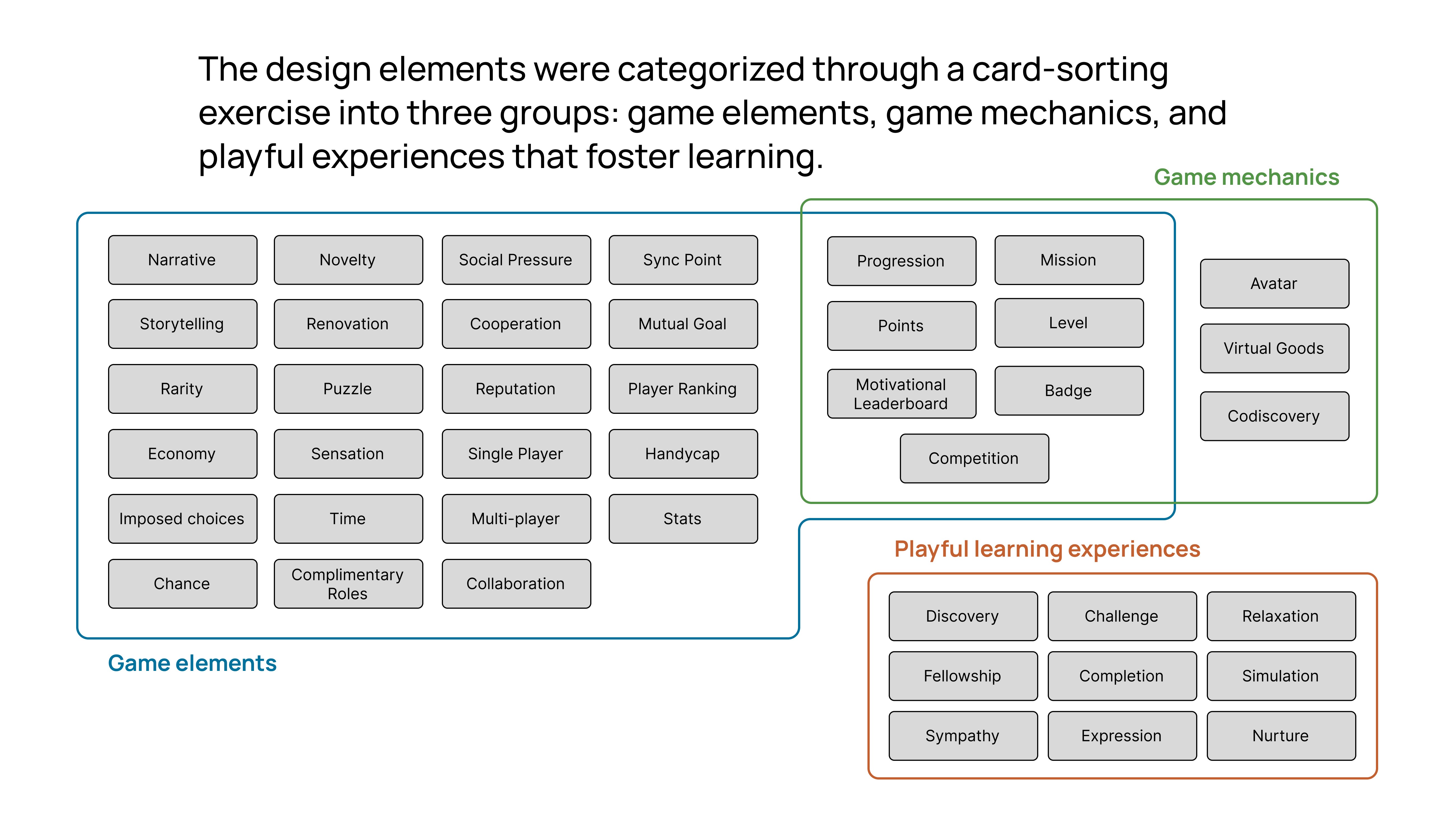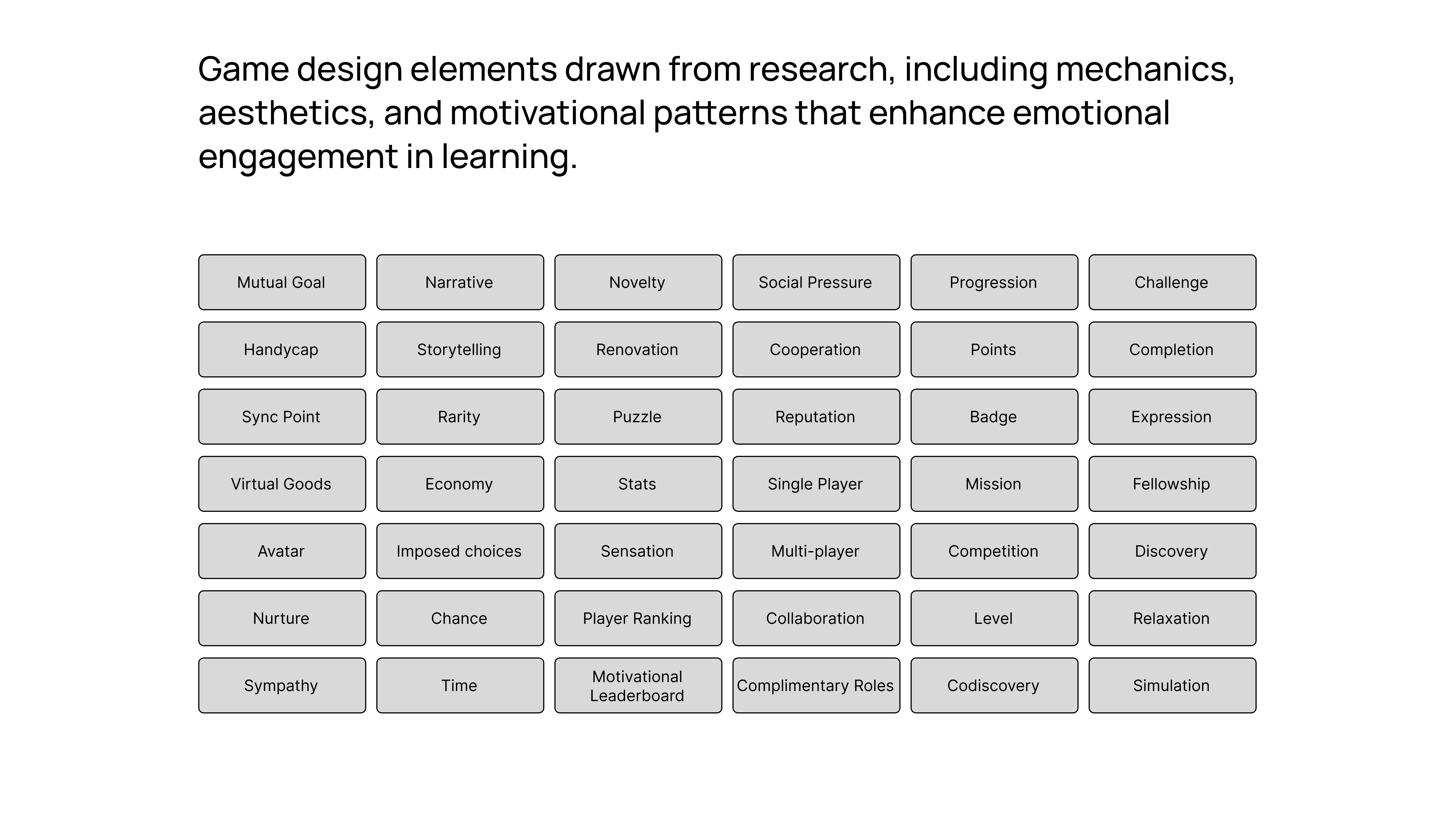 I researched commercial game structures and studied recurring patterns and mechanics to simplify the creatively challenging aspects of designing game-based learning experiences.